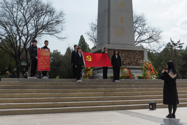 朝日初升,在革命烈士纪念碑前,全体人员在烈士纪念碑前整齐列队,奏唱中华人民共和国国歌。奏唱结束后,全体人员低首肃立,向为中国人民解放事业和共和国建设事业英勇献身的烈士默哀,表达对先烈的深切哀悼和崇敬之情。之后,伴随着悲壮的乐曲,员工代表手抬花篮,迈着沉重的步伐,向烈士纪念碑敬献花篮,整个过程庄严肃穆,井然有序。随后,辅导员王铭聪带领大家重温入党誓词,庄严的誓词铿锵有力、字字入心,以铮铮誓言表达向革命先烈学习的决心、坚守忠诚于党的初心和为党的事业奋斗终身的恒心。之后,员工代表赵子赫向烈士献词,表达了对革命烈士们的沉痛追思与哀悼,并号召同学们继承先辈遗志,发扬优良传统,为中华民族伟大复兴而不懈奋斗!最后,全体师生列队,依次为革命烈士献花并致以崇高的敬意。